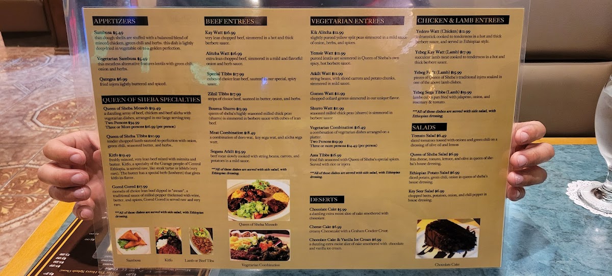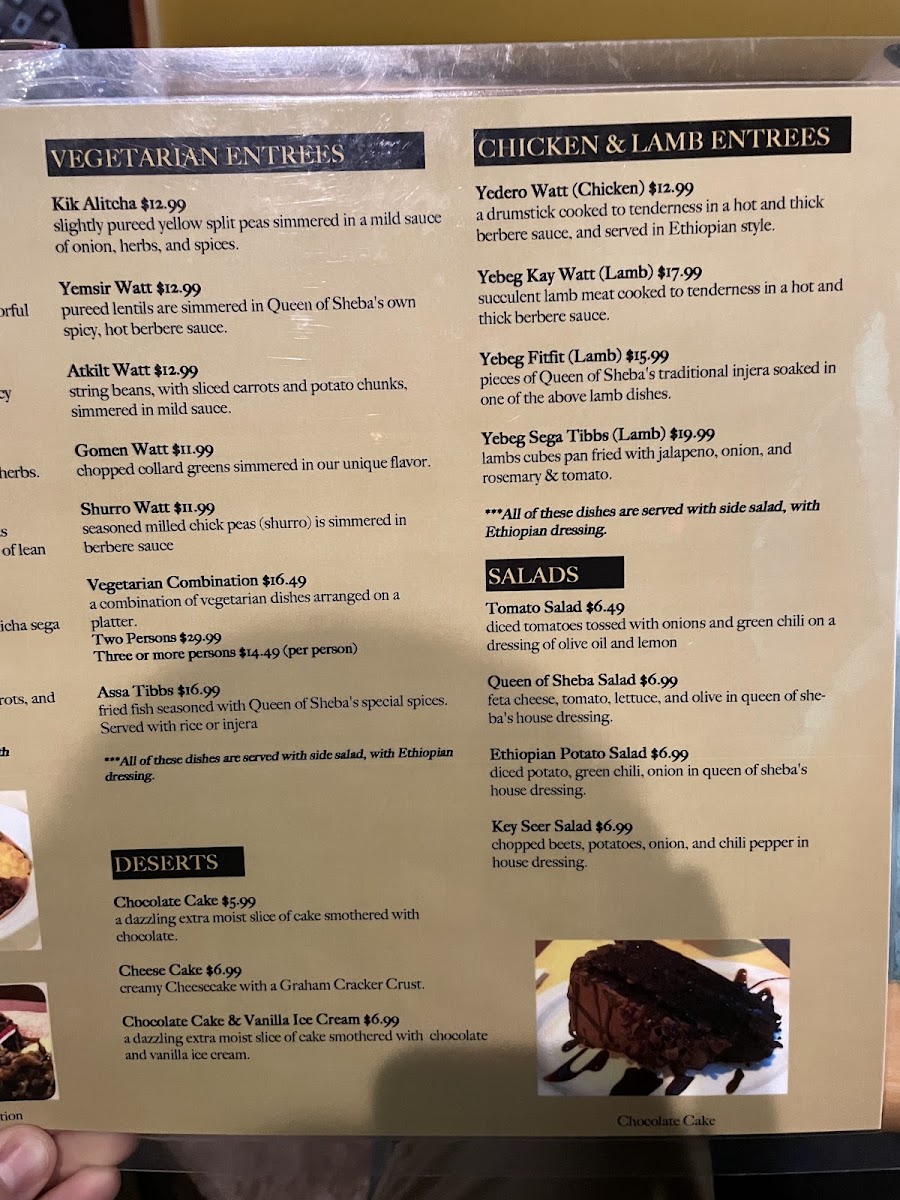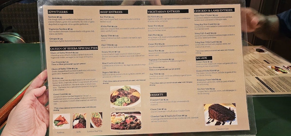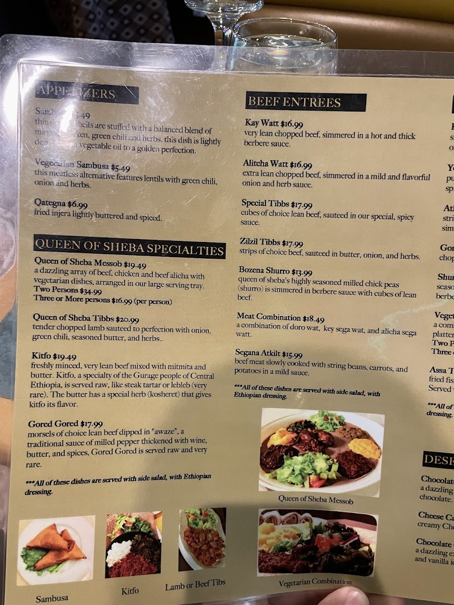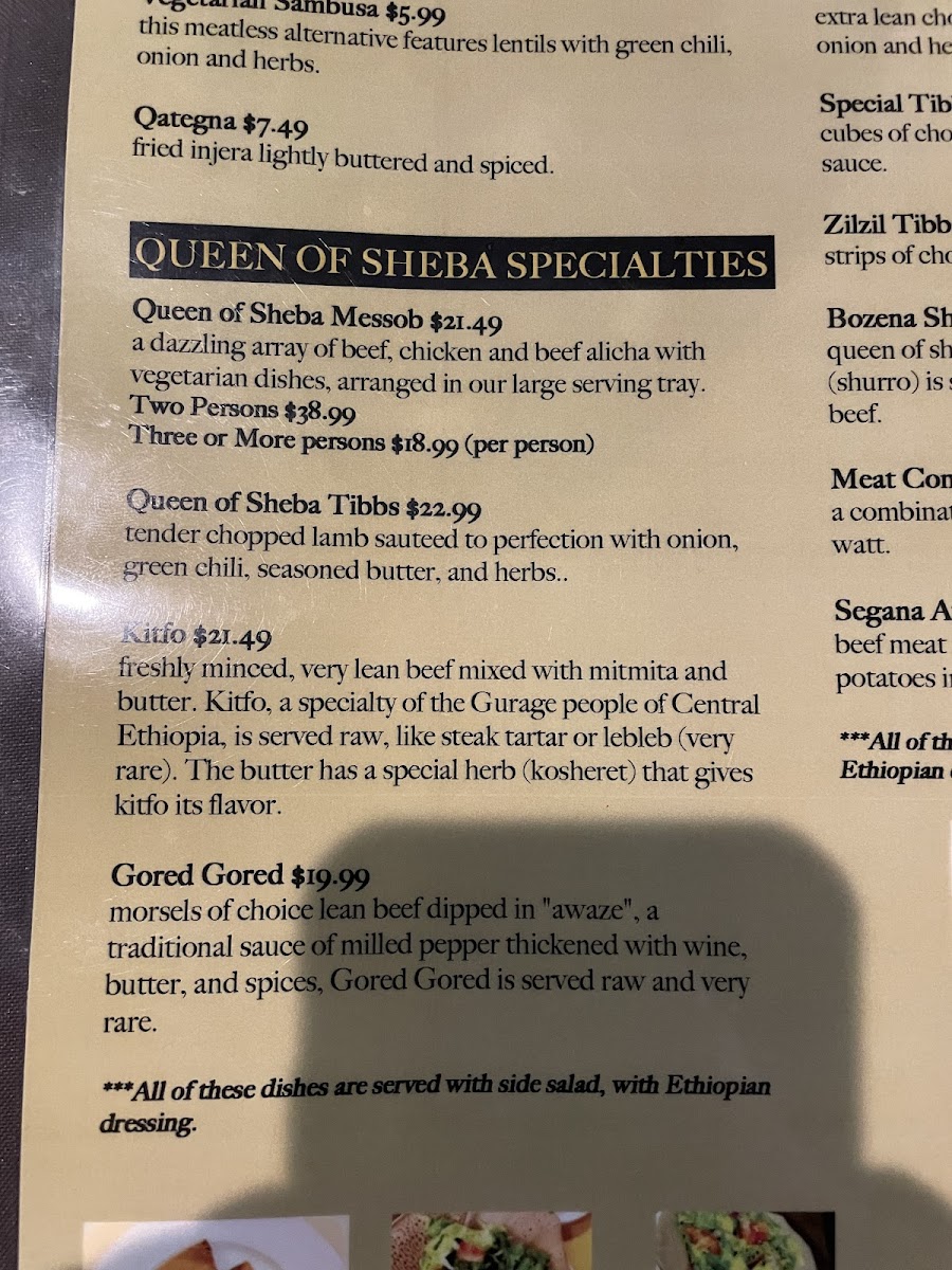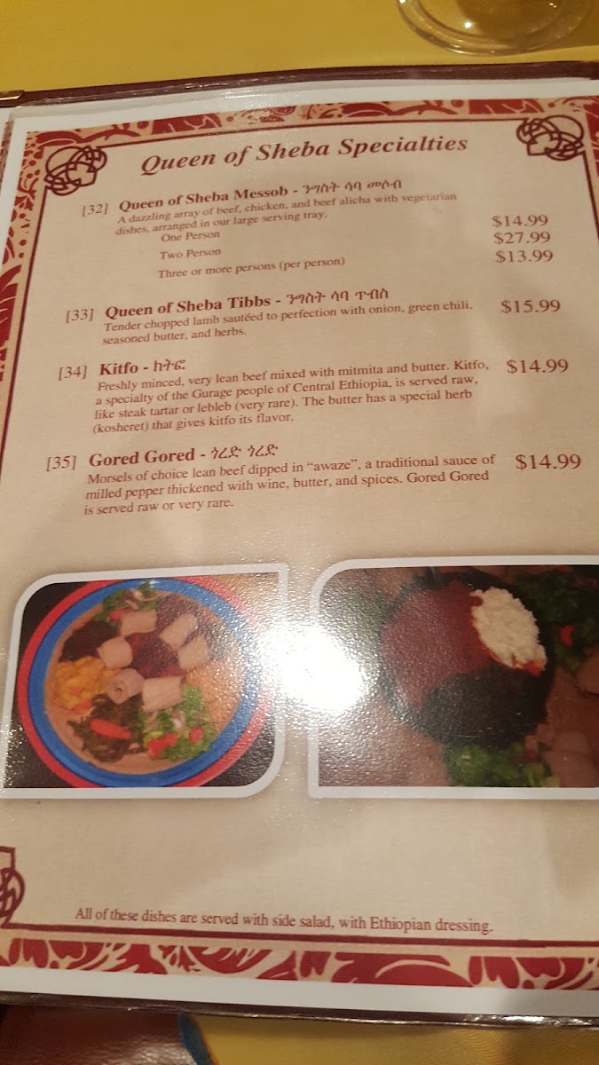 pieces of queen of sheba's traditional injera soaked in one of the above lamb dishes.