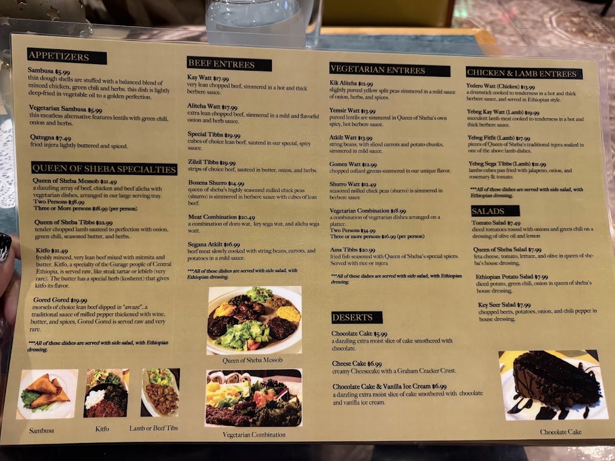 fried fish seasoned with queen of sheba's special spices. served with rice or injera.