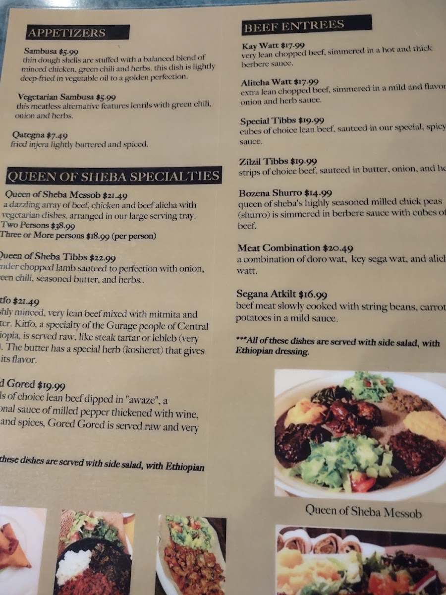 queen of sheba's highly seasoned milled chick peas (shurro) is simmered in berbere sauce with cubes of lean beef.